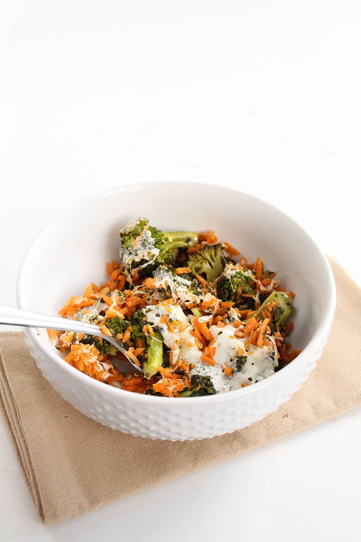 The casserole by itself is a filling and surprising meal. Surprising? Yes! You won’t believe it’s not real rice! The sweet potato rice cooks to a perfect consistency in the 40 minutes in the oven and the savory flavors from the mozzarella and pesto pair well with the sweetness that comes from the potato when roasting.